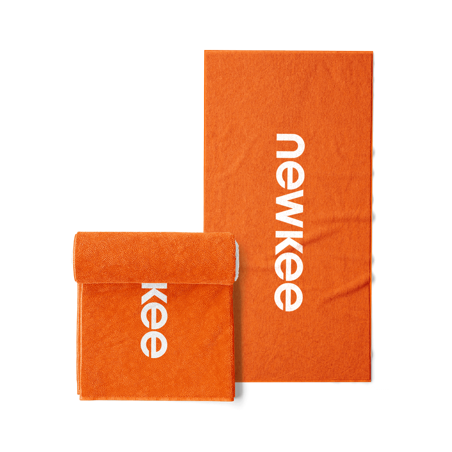 Das newkee Badetuch aus Baumwolle ist leuchtend orange mit dem weißen newkee Logo