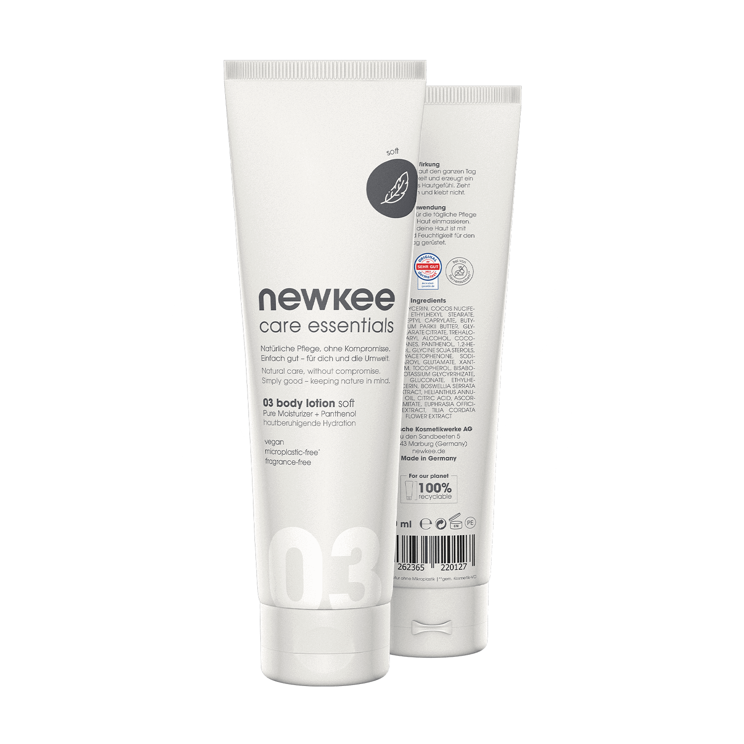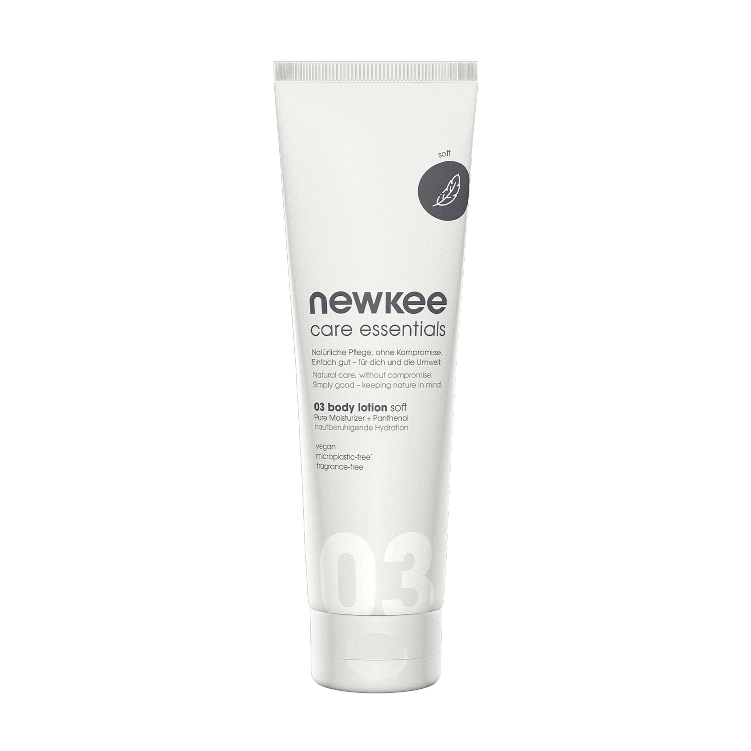 Die newkee body lotion soft ist eine vegane und nachhaltige Pflege für trockene Haut. Die sanfte Bodylotion ohne Schadstoffe, Parfüm und Duftstoffe ist zudem frei von Mikroplastik, Parabenen und Silikonen.
